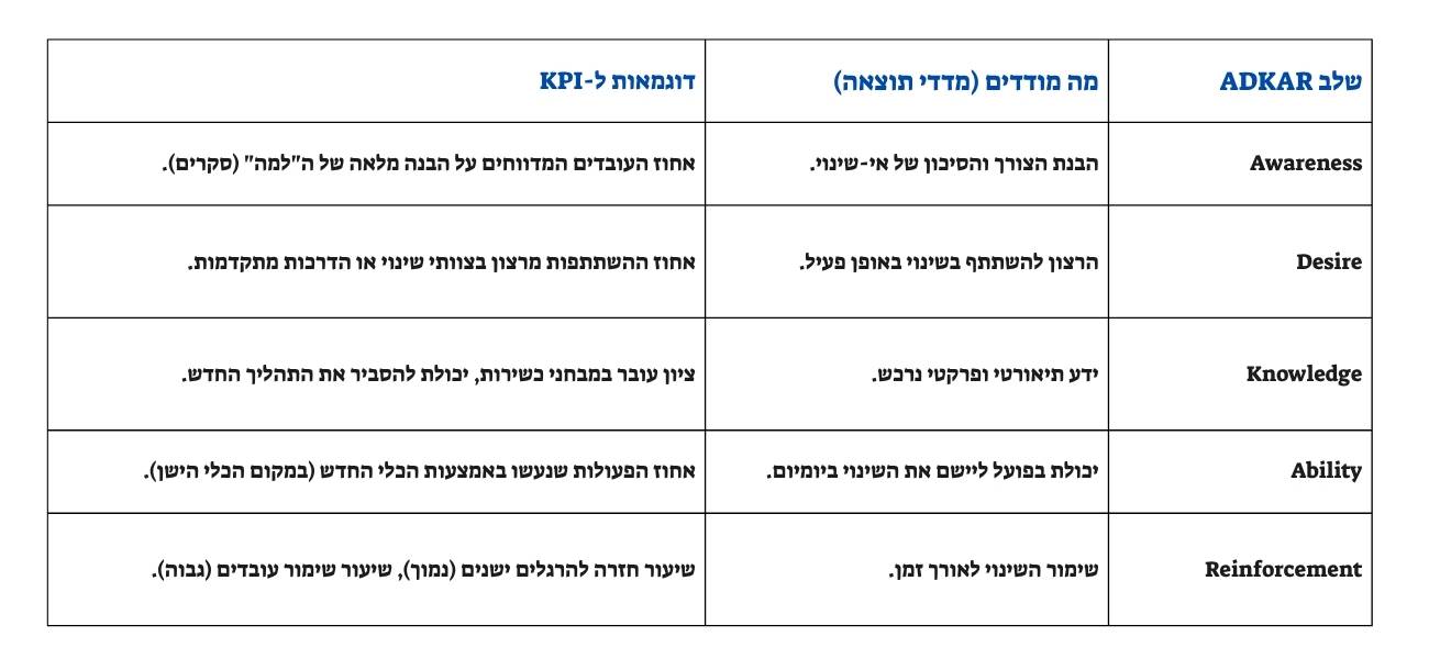 מדידת הצלחה אנושית היא המורכבת ביותר, וכאן נכנס מודל ADKAR ככלי פרקטי. המודל מספק מדדים התנהגותיים לכל שלב, במקום להסתמך על תחושות בטן: